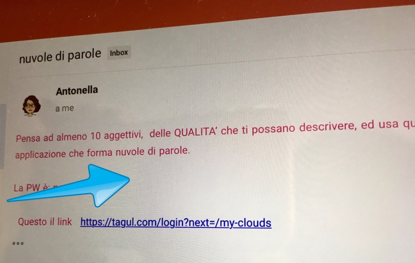 E’ il momento di conoscere un’applicazione che permette di creare gruppi, “nuvole” di parole, cioè un wordclouds, come Tagul. Cliccando sul link della mail ad ogni alunno si aprirà la possibilità di pensare e scrivere da 5 a 10 aggettivi qualificativi che riguardano il loro aspetto fisico o il carattere .