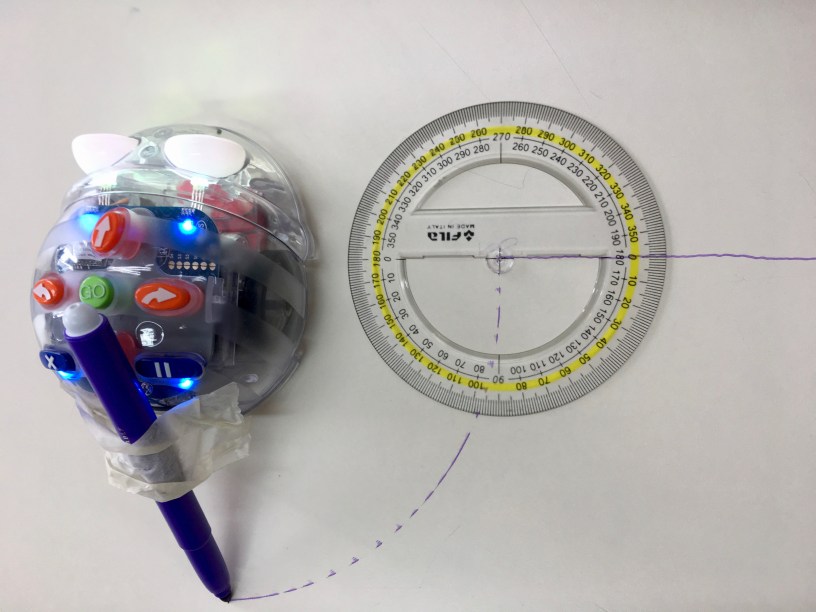 La settimana scorsa non abbiamo usato la griglia trasparente con i quadrati da 15 cm, ma Matematik ha viaggiato sul tavolo giallo e verde facendo cambi di direzione e dei bei giri a 360° con il pennarello sulla schiena alla scoperta degli angoli…Matematik e gli angoli