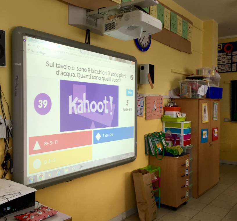 Kahoot è uno dei più conosciuti generatori di quiz ed in classe noi lo usiamo come momento stimolante per un veloce ripasso. Rispetto ad altri strumenti pensati per la creazione e la somministrazione di quiz dedicati alla didattica con Kahoot il momento dell’esecuzione del test si svolge in modo divertente e collettivamente. Questo ad esempio è sul verbo avere mentre qui trovi dei problemi stile Invalsi. La classe si suddivide in gruppi ed ogni squadra ha un iPad con il quale risponderà alle domande del Kahoot . Crearne uno è facile anche se la lingua è l’inglese: all’inizio della classe seconda un gruppo di tre ne ha creato uno sulle tabelline . Per giocare occorre registrarsi con un numero/pin che si genera in automatico ed un nickname. Una musica ritmata scandisce il tempo delle domande. Un kahoot è sempre molto coinvolgente.