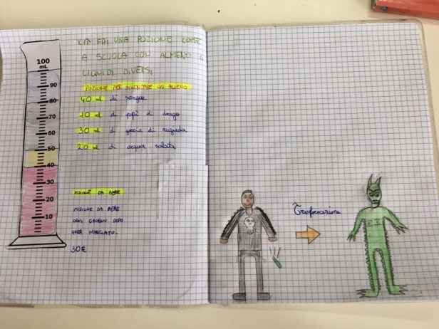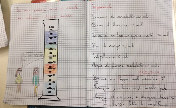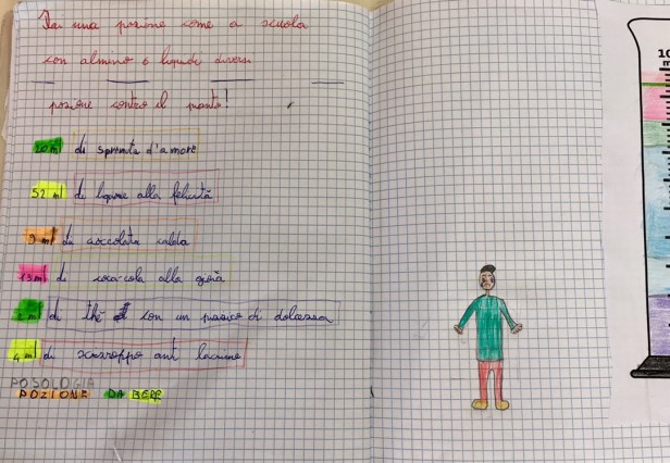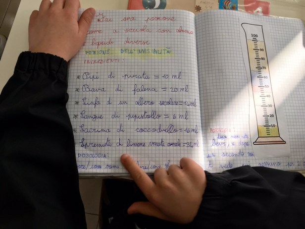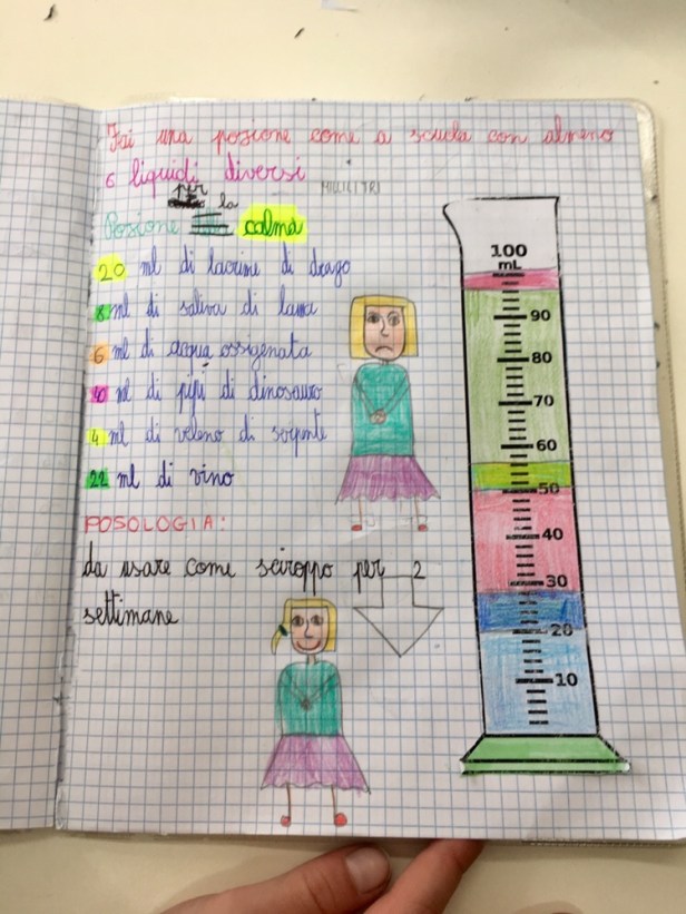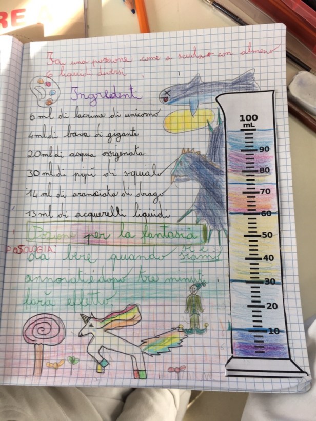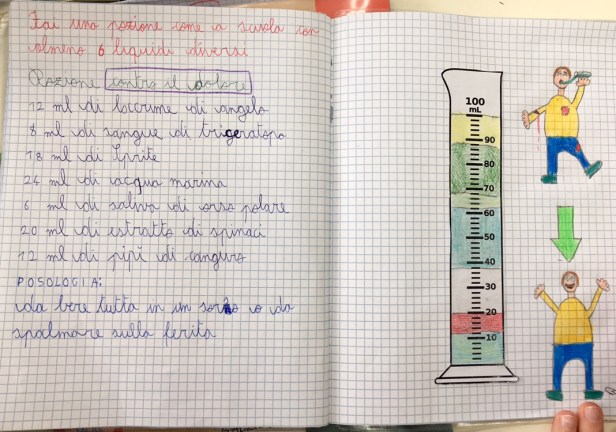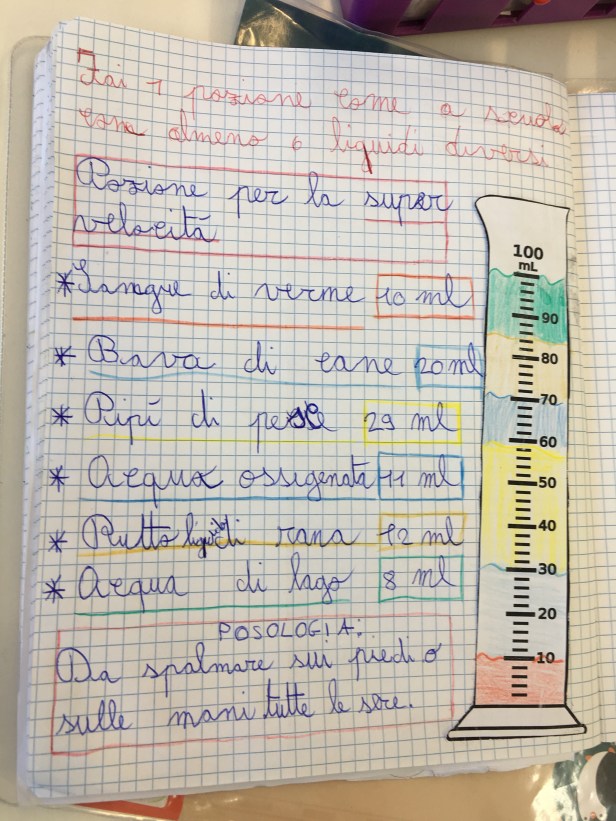 Siccome misurare è divertente, stamani, con un po’ di fantasia e dei misurini di carta da 200 ml sono state inventate anche delle magiche pozioni per o contro qualsiasi cosa venisse loro in mente.