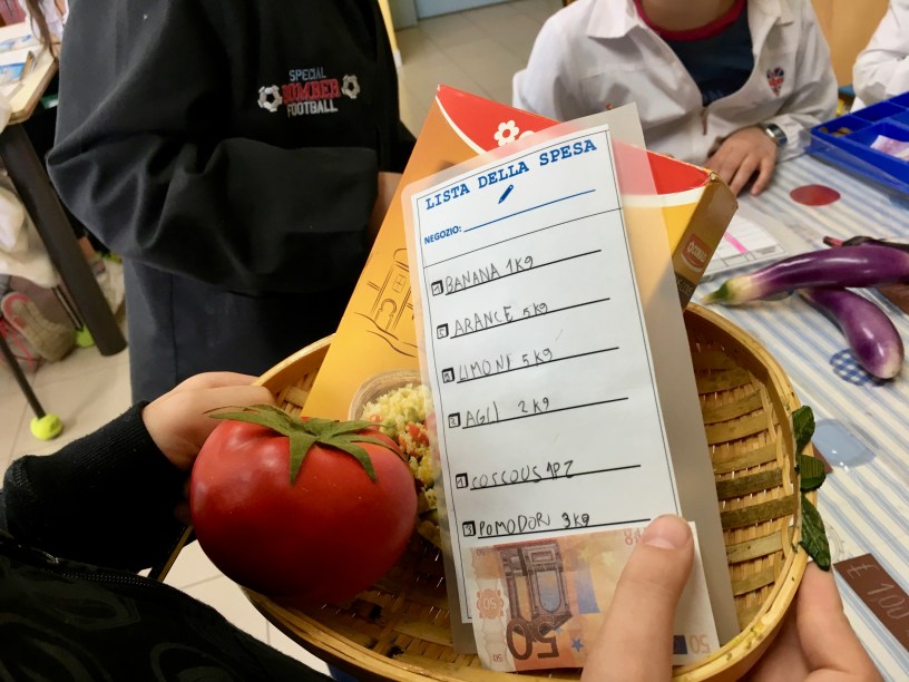 Gli attori della compra-vendita si sono materializzati fino alla spesa dei clienti al banco del negozio con tanto di lista della spesa, denaro, scontrini alla cassa per i calcoli e borse riciclate!