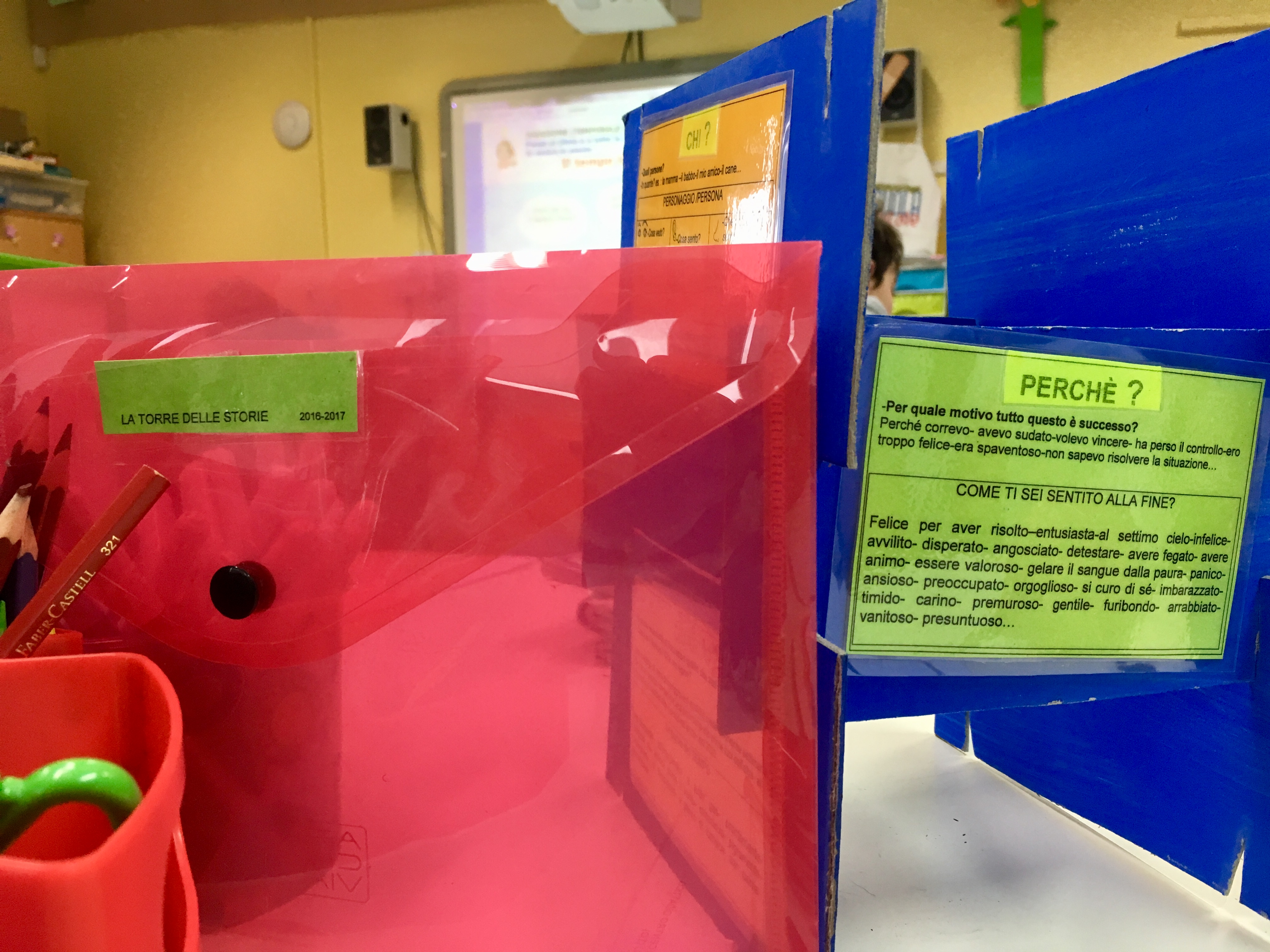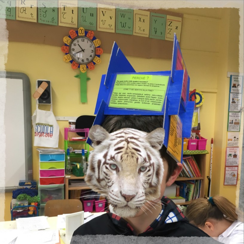 Poi in terza con del cartoncino ho creato i pezzi, le parti della “Torre delle Storie” per far visualizzare come un testo debba essere costruito mattone su mattone. Poichè la pianificazione e la stesura di uno scritto sono passaggi critici per iniziare a redigere un testo, in quarta ed in quinta abbiamo lavorato molto su questo. Dalla “Tempesta di Cervelli” delle idee alla stesura della scaletta prima collettivamente poi individualmente. Essendo io molto visuale, ho cercato di rendere questa fase molto concreta attraverso immagini che richiamassero questo momento.