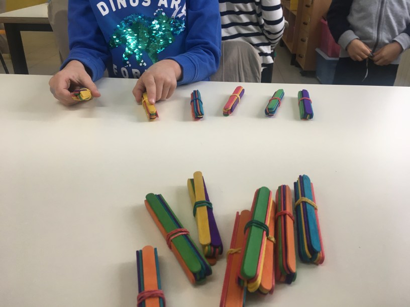 Per questa attività mi è venuto in soccorso il “caro” signor Amazon che mi ha procurato tanti bastoncini colorati di legno come quelli usati nei ghiaccioli. I bambini dovevano semplicemente contare fino a 10 e poi legare i mazzetti-decine con gli elastici. Alla fine sono rimasti anche dei bastoncini-unità sciolti che non hanno potuto formare alcun mazzetto.