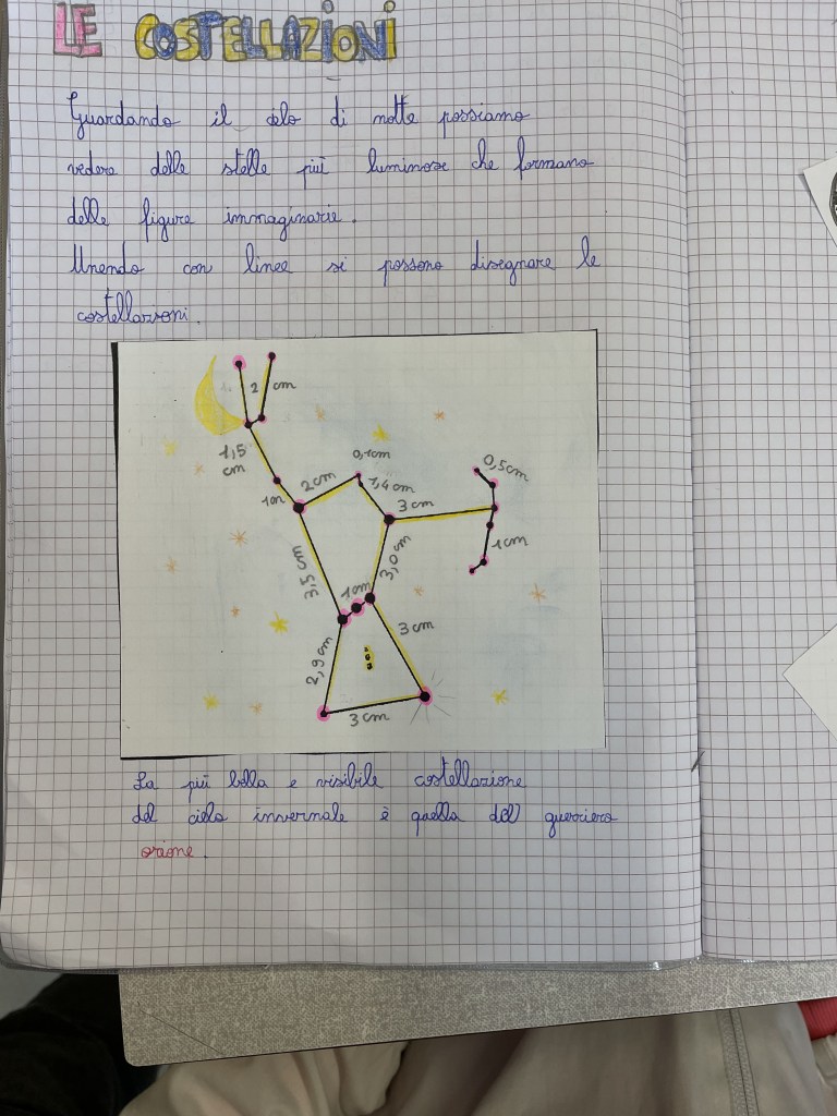 Se guardiamo il cielo invernale in una sera senza nuvole vediamo che alcune stelle appaiono più luminose e spiccano sulle altre. I bambini sono stati invitati ad osservare il cielo nelle prime ore della sera ed ad individuare la costellazione osservata in classe con l’app Stellarium: Orione. Con un po’ di fantasia vediamo una figura di un uomo con una cintura ai fianchi. Quello che avevano già pensato gli antichi identificando questo insieme di stelle con il personaggio leggendario di Orione, cacciatore con la spada appesa alla cintura, il braccio sinistro che si protende in avanti con lo scudo ed il destro pronto a colpire. Le figure immaginarie disegnate unendo con linee ideali stelle in apparenza vicine sulla volta celeste sono dette costellazioni.