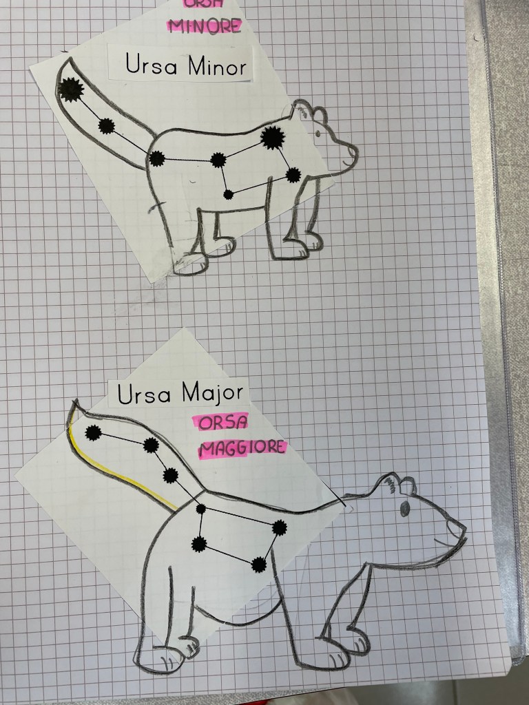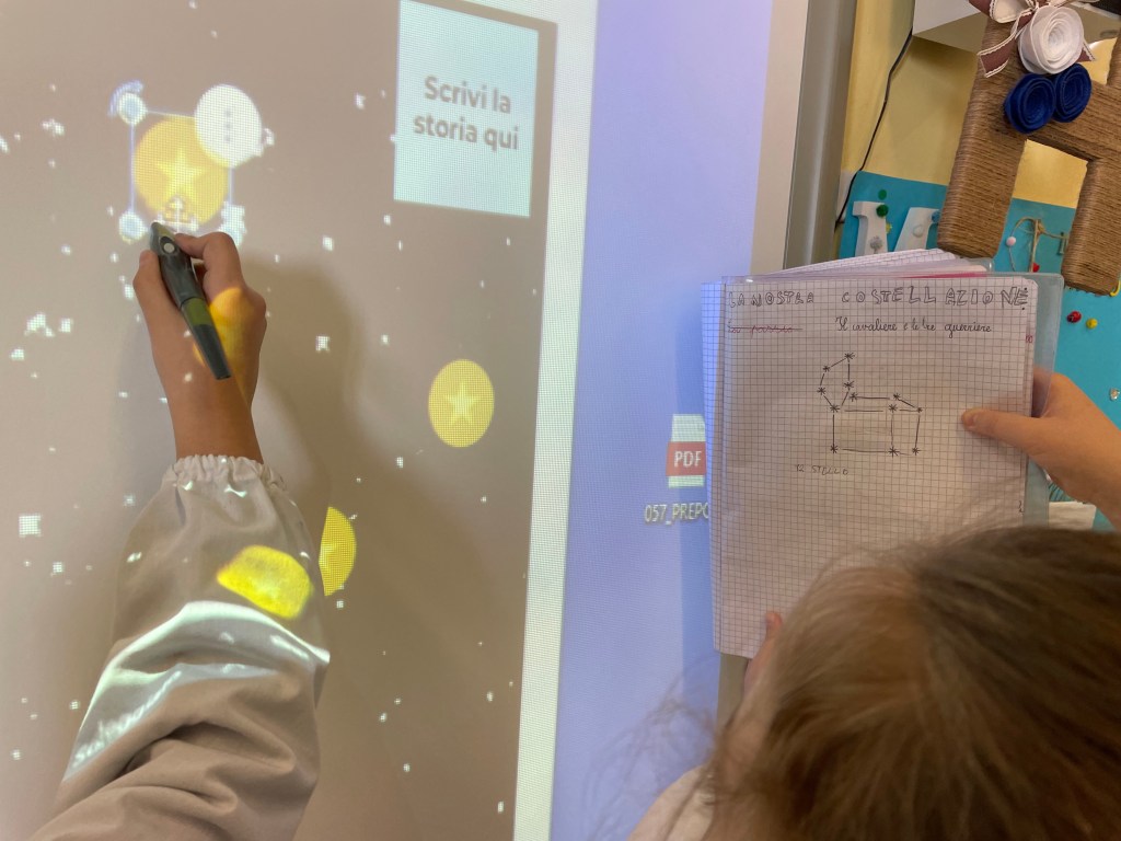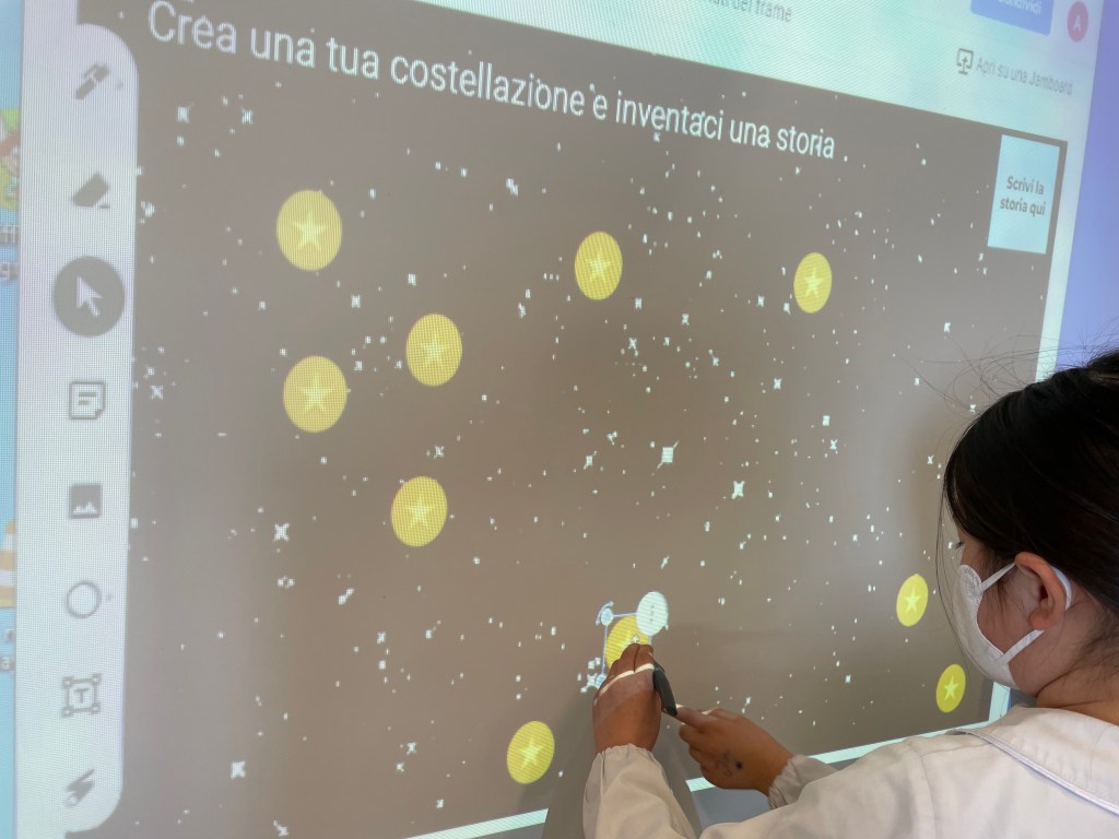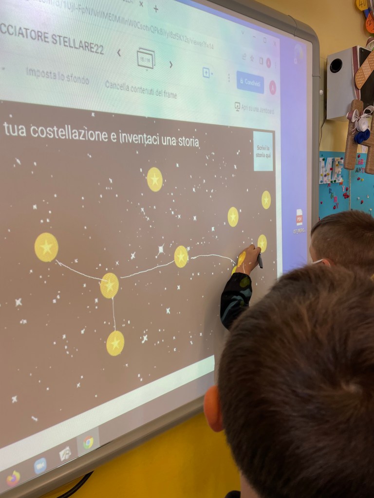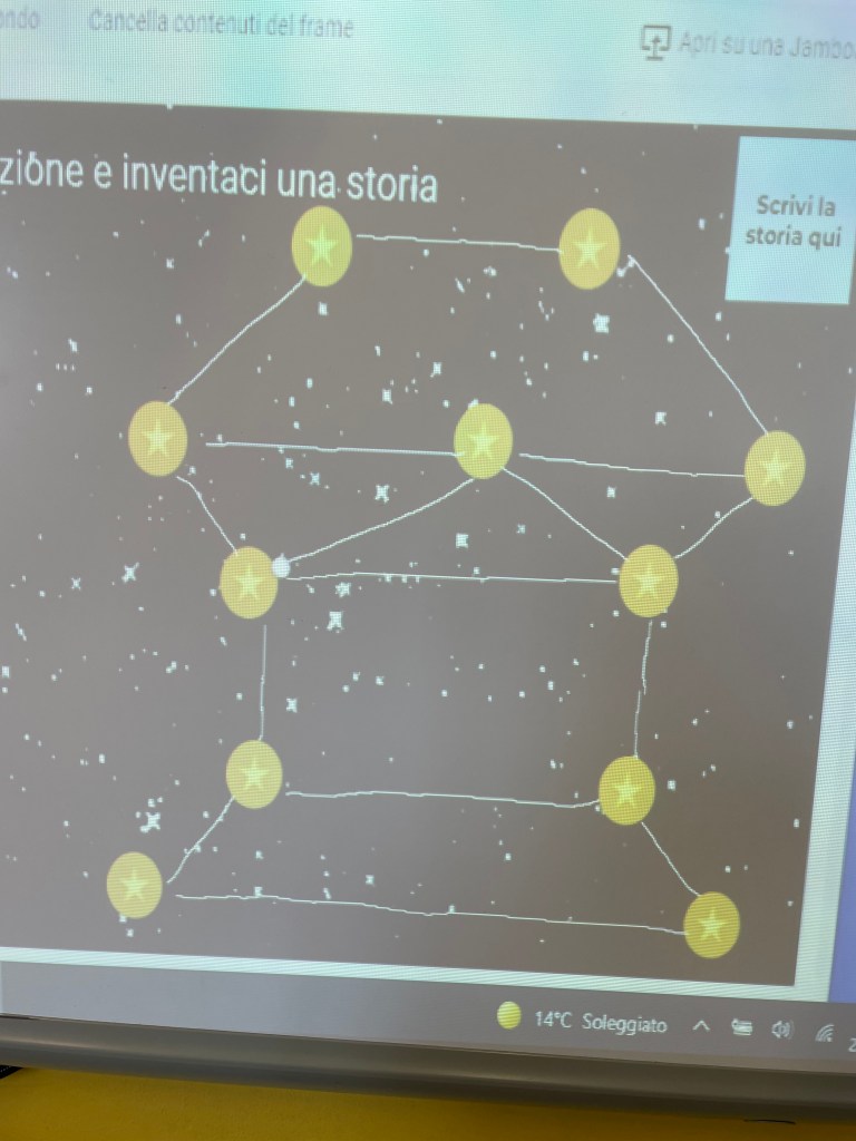 Successivamente, divisi in gruppi hanno creato delle costellazioni ed inventato delle storie su di esse. Grazie alla LIM ed all’app Jamboard di Google ogni gruppo ha mostrato la propria costellazione alla classe.